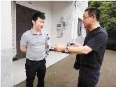 周教授(右)和副镇长胡伟炎在村委会办公楼前继续交流。