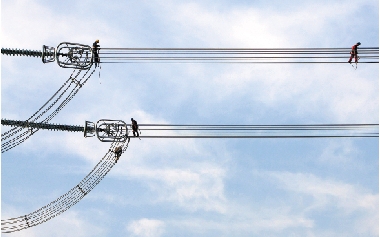 7月15日,嘉善境内“皖电东送”特高压工程通过验收。图为电力工人在高压铁塔上“走线”验收。 胡凌翔 张敏 摄