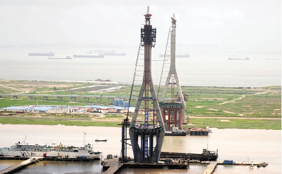 7月15日,舟山普陀小干大桥两侧主墩桥塔顺利封顶。小干大桥为双塔双索斜拉桥,总长4745米,总投资4.9亿元,计划于2014年10月底完成。 舟山日报记者 胡社友 摄