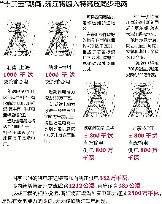 这些工程的相继投运,浙江将新增省外受电能力超过2500万千瓦,是现有受电能力的3倍,大大缓解浙江缺电问题。