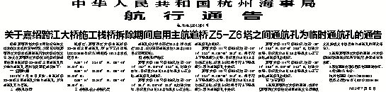 根据嘉绍跨海大桥工程建设总体安排和施工水域的具体情况,为保障穿越嘉绍跨江大桥水域船舶航行和大桥设施安全,决定在嘉绍跨江大桥施工栈桥拆除期间启用主航道桥Z5-Z6塔之间通航孔作为临时通航孔,现将有关事项通告如下: