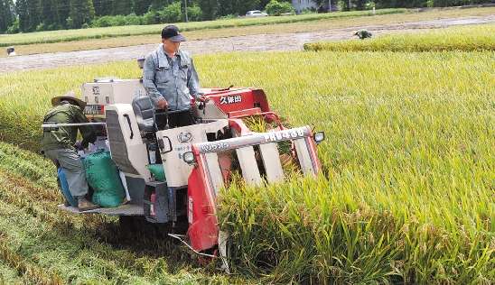 7月16日,诸暨市王家井镇淀荡畈村早稻示范方里,种粮大户王柯芳310多亩早稻开镰收割。