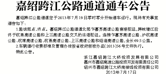 嘉绍跨江公路通道定于2013年7月19日零时零分开始通车运行。现将有关事宜通告如下: