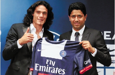 7月16日,上赛季法甲联赛冠军巴黎圣日耳曼俱乐部召开新闻发布会,宣布与上赛季意甲联赛最佳射手,乌拉圭籍球员埃丁森·卡瓦尼(左)签约五年。据报道,卡瓦尼的转会费用接近6400万欧元,创下法甲新高。 新华社发