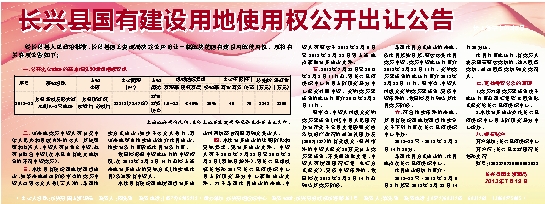 四、本次公开出让的详细资料和具体要求,见公开出让文件。申请人可于2013年7月22日至2013年8月8日(双休日除外),到长兴县雉城镇长海路361号长兴县招投标中心国土资源交易分中心获取出让文件。对于采用挂牌出让的宗地,申请人可继续于2013年8月9日至2013年8月23日到上述地点获取公开出让文件。