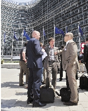 7月17日,在比利时首都布鲁塞尔的欧盟委员会大楼外,30余家欧洲光伏企业代表准备出席一场欧盟听证会。30多家欧洲光伏企业当日在欧盟委员会举行的一个专门听证会上恳求欧委会尽早“醒悟”,停止对中国光伏产品征收惩罚性关税,以避免对欧洲光伏产业更大的伤害。 新华社记者 叶平凡 摄