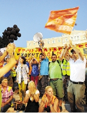 7月17日晚,在希腊雅典市中心的宪法广场,示威者抗议该国政府拟推行的新一轮紧缩措施。希腊议会18日凌晨通过一揽子紧缩法案,为希腊近期获得数十亿欧元的救助贷款铺平了道路。 新华社发