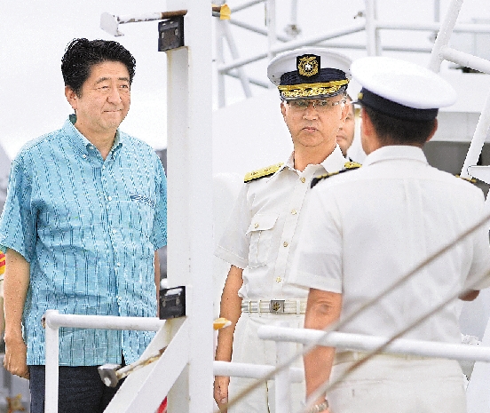 7月17日,在日本冲绳县石垣岛,日本首相安倍晋三(左一)视察海上保安厅的巡视船。日本首相安倍晋三当天抵达冲绳县石垣岛后视察海上保安厅巡视船。据报道,安倍当天还将前往宫古岛视察航空自卫队基地。石垣、宫古二岛离钓鱼岛仅不到200公里距离。 新华社发