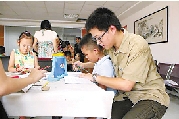 杭州蒋村街道文体活动中心里,家长和孩子们一起参与街道免费夏令营培训班,该夏令营已举办了三届。
