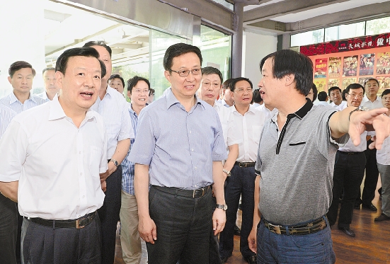 7月18日上午,上海市党政代表团在杭州长城影视股份有限公司考察。 本报记者 黄曙林 摄