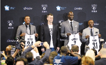 图为网队老板普罗霍洛夫在新闻发布会上与加内特(右二)、皮尔斯(左一)和特里(右一)一起亮相。 新华社发