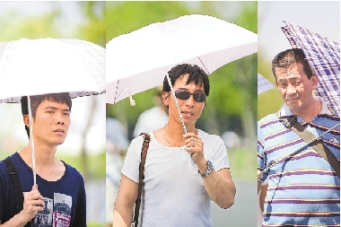 7月19日,杭州西湖景区,许多男士抵挡不住猛烈的阳光,纷纷打起了遮阳伞。 本报记者 杨晓轩 摄
