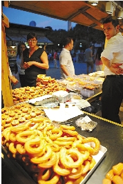 7月18日,在土耳其伊斯坦布尔蓝色清真寺旁的广场上,市民在一家糕点摊位前观看。斋月期间,伊斯坦布尔举办土耳其特色商品集市,吸引大批市民和游客前来。 新华社记者 卢哲 摄