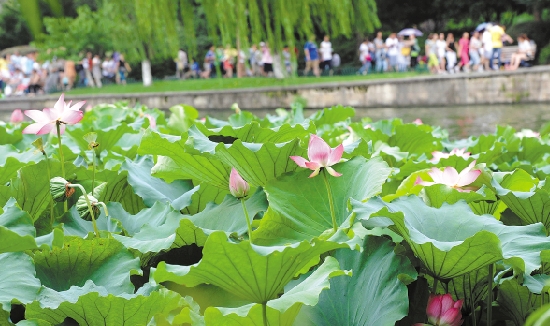 7月21日,杭州天气酷热,但一拨又一拨市民和游客来到西湖景区赏荷。眼下,西湖荷花大面积绚丽绽放,进入盛开期。 本报记者 吴元峰 摄