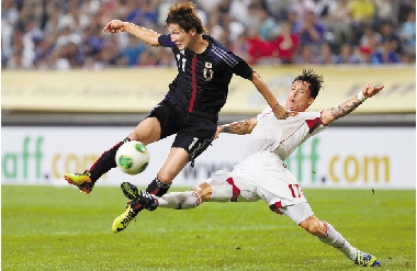 7月21日,中国队球员张琳芃(右)与日本队球员原口元气拼抢。 新华社发