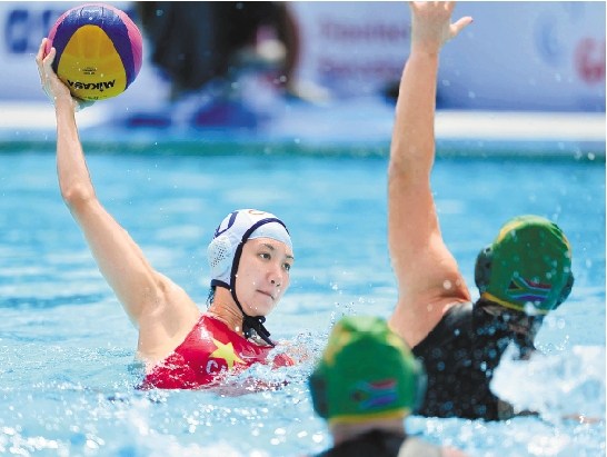 7月21日,中国队球员马欢欢(左)在比赛中进攻。当日,在第15届世界游泳锦标赛女子水球小组赛中,中国队以17比2战胜南非队。 新华社发