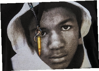 一只弹壳钥匙扣挂在身穿印有特雷翁·马丁头像的T恤衫的示威者胸前。