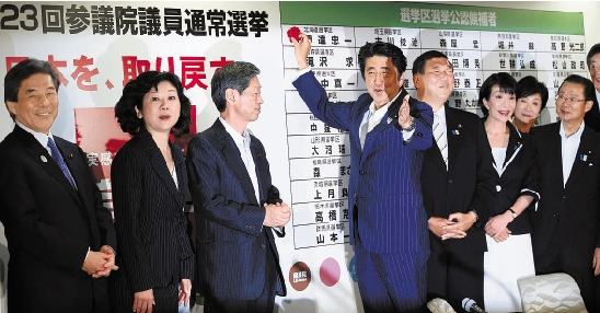 7月21日,在日本东京自民党总部,日本首相、自民党总裁安倍晋三(中)将红花贴在该党当选议员的名字上。 新华社发