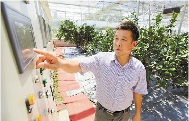 冯贻法把智能温室大棚橘子视作宝贝,每天精心养护。 叶晖 摄