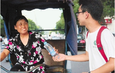 昨天,浙江师范大学“筑台逐梦”22名实践队队员免费送水给街头、工地上的劳动者。 记者 陈敢 通讯员 陈胡南 陈道平 摄