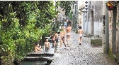 夏夜,孩子们在水渠恣意玩耍。