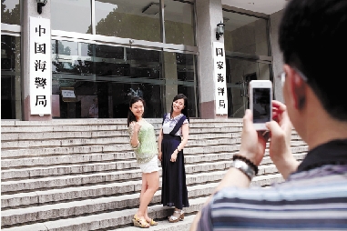 7月22日,国家海洋局员工在新牌匾前留影。 新华社记者 金立旺 摄
