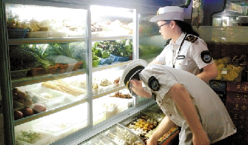 江东区食品药品监督管理局的稽查队员在对食品进行抽查。