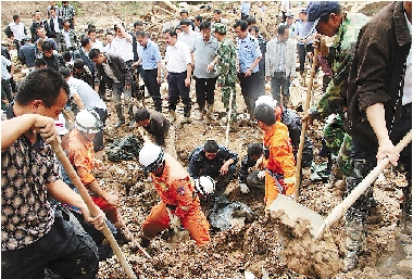 7月26日,消防官兵在天水市秦州区娘娘坝镇刘家河村挖掘被埋群众。近日,甘肃省天水市连续遭遇4次暴雨洪涝灾害,截至目前已导致7人遇难15人失踪。