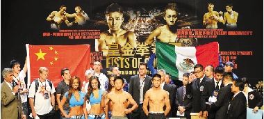 7月26日,中国拳手邹市明(前左)和墨西哥拳手奥尔特加(前右)出席“皇金拳赛”赛前称重活动。7月27日晚,中国拳手邹市明将二度踏上职业拳台——在澳门上演的“皇金拳赛”,挑战墨西哥拳手奥尔特加。 新华社发