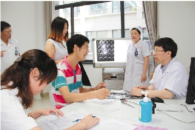 7月28日,浙医二院二十多位医学博士和专家,冒着酷暑来到兰溪人民医院开展义诊活动,为当地群众把脉问诊。 徐晓恩 王寅锋 胡亚玲 摄