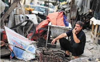 7月21日,在伊拉克首都巴格达凯拉代区,一名男子蹲在遭到汽车炸弹袭击的市场里。 新华社发