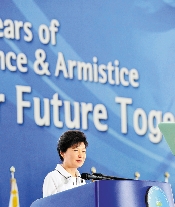 7月27日,在韩国首尔,韩国总统朴槿惠在纪念朝鲜战争停战60周年活动上讲话。 新华社发
