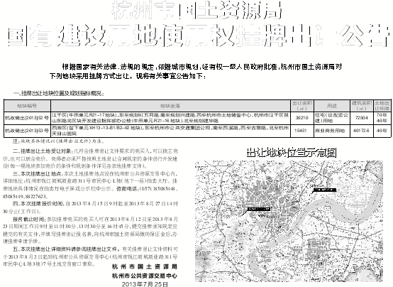 五、本次挂牌出让详细资料请参阅挂牌出让文件。有关挂牌出让文件资料可于2013年8月2日起到杭州市公共资源交易中心(杭州市钱江新城新业路311号市民中心L楼3楼)7号土地交易窗口索取。