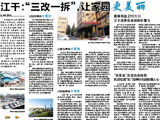 配合杭州(九乔)国际商贸城大项目建设,九堡镇三卫区块,仅用13天签约816户,完成率达100%,创出“三改一拆”的“九堡速度”;更换电子防盗门对讲系统、安装新探头、修补漏水屋顶,结合“三改一拆”工程进行的老旧小区改善,让建于上世纪80年代的天杭社区“旧貌换新颜”;占地十多亩、原本堆积材料的旧仓库,经过整体设计改造焕然一新,变身网罗各类建筑设计精英的文化创意产业园……