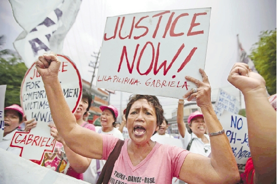 当地时间2013年7月27日,菲律宾马尼拉,前菲律宾“慰安妇”和支持者聚集在总统府外举行示威活动,声称是二战期间日本军国主义的受害者,抗议日本首相安倍晋三造访。示威者谴责菲律宾和日本加强军事关系。 视野网供图