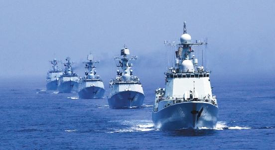 在“海上联合—2013”中俄海上联演中,中国海军舰艇编队进入实际使用武器演习海域(7月10日摄)。 新华社记者 查春明 摄