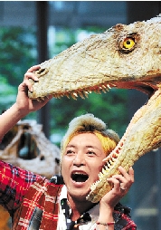 8月1日,在日本东京一恐龙展览上,日本艺人鹤野刚士在恐龙模型前拍照。当日,为期18天的恐龙展在东京开幕。 新华社发