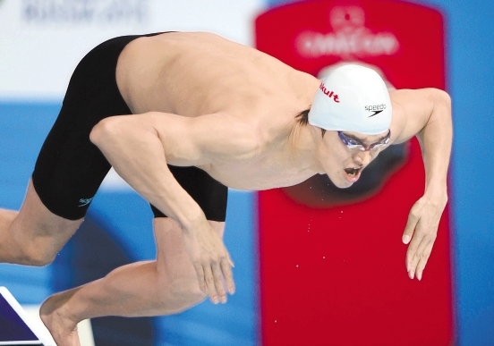7月31日,在第15届世界游泳锦标赛男子800米自由泳决赛中,中国选手孙杨以7分41秒36的成绩夺得冠军。图为孙杨在决赛中出发。 新华社发