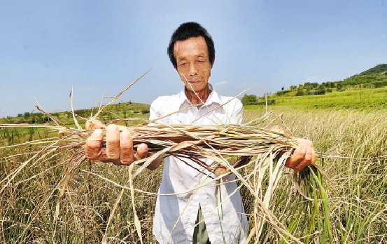 7月以来,湖南省遭遇近10年来最严重的旱灾。图为8月1日,湖南衡阳市祁东县蒋家桥镇的一名村民手捧枯死的水稻。 新华社记者 龙弘涛 摄