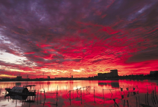 8月2日早晨,一大片火烧云出现在绍兴上空。“朝霞暮霞,无水煮茶。”这预示着又有一波热浪袭来。 李瑞昌 摄