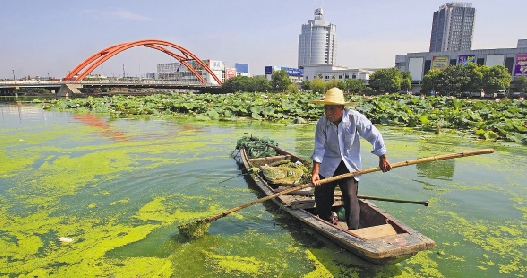 7月27日,河道保洁工在柯桥城区10余公里的古运河上,打捞蓝藻及其它漂浮物。