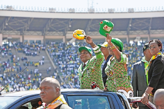 这是穆加贝在津巴布韦首都哈拉雷国家体育场举行的竞选集会上向支持者挥手的资料照片(7月28日摄)。