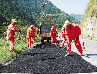 高温桑拿天,景宁县公路管理局的养路工在228省道景宁段修补破损路面、坑洞、清理公路排水沟。 通讯员 王云富 摄