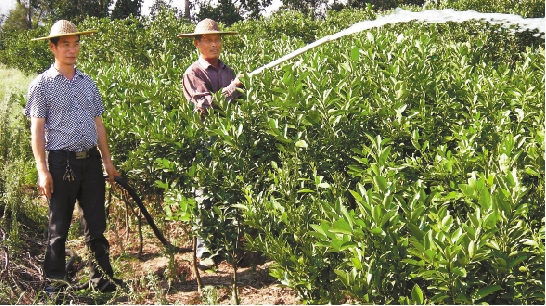 在台州椒江区新佳果柑橘专业合作社的生产基地,社员正在浇水。 陈敢 陈道平 摄