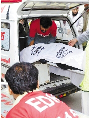 8月6日,在西南部俾路支省首府奎达,志愿者将一名遇难者遗体抬出救护车。巴基斯坦俾路支省5日晚发生两辆长途客车被武装分子劫持事件,23人遭绑架。警方6日发现其中13人已经遇害,另外10人下落不明。 新华社发