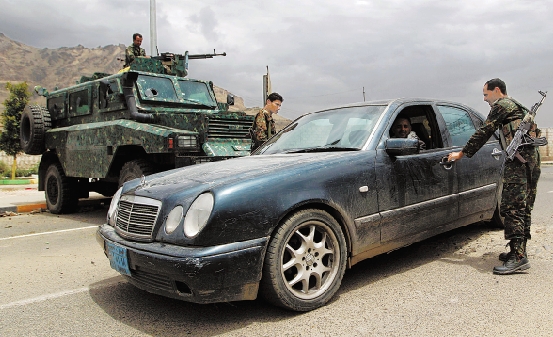 8月4日,在也门首都萨那一条通往美国大使馆的道路上,士兵检查来往车辆。 新华社发