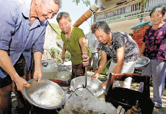 | 8月6日,奉化市大堰镇石井村建好了抽水泵,村民在集中供应点分享清泉水。连日高温,大堰镇高山小溪断流,300多户村民饮水困难,镇政府和有关部门积极帮助村民寻找水源,安装抽水泵,送水上山和分时分段供应,使家家户户都能喝上清洁水。 记者 吴晓鹏 通讯员 毛节常 摄 |
