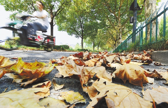 8月6日,在杭州市曙光路上落满了金黄梧桐叶。面对高温酷暑,树叶变黄掉落,可减少叶面的水分蒸腾,这也是树木的一种自卫。当日,杭州再创高温新纪录。 本报记者 杨晓轩 摄