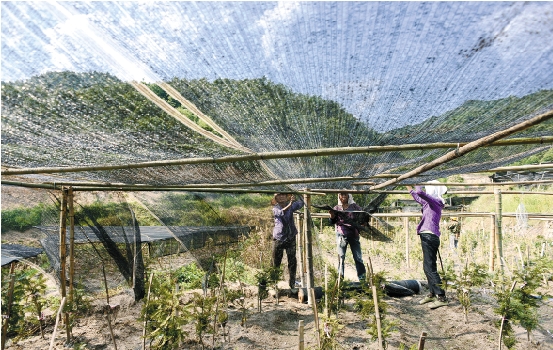 连日高温使奉化7400多人用水困难,5万多亩庄稼缺水。当地村民正千方百计全力抗旱。图为8月8日,溪口镇锦溪村村民给香榧苗搭遮阳篷。 本报记者 董旭明 通讯员 纪深红 摄