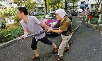 8月10日,杭州虹园社区居民扛来水管,浇灌社区绿化带。